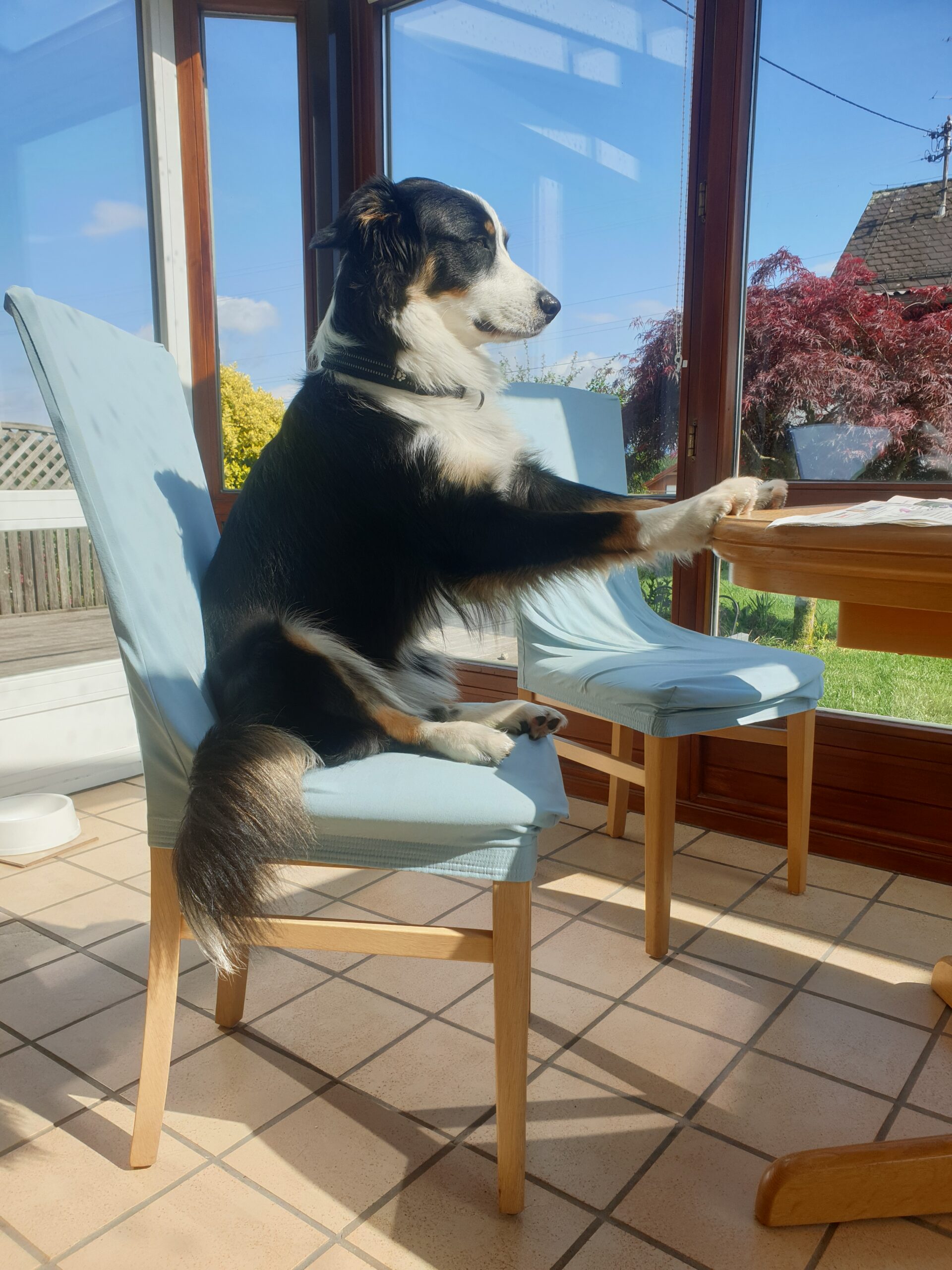 🐾 Abby-Moment: Meine Hündin Abby setzte sich neben mich auf den Stuhl, Hüfte schief abgeknickt wie meine. Kein Kommando, kein Keks. Nur Beobachtung → Übernahme.