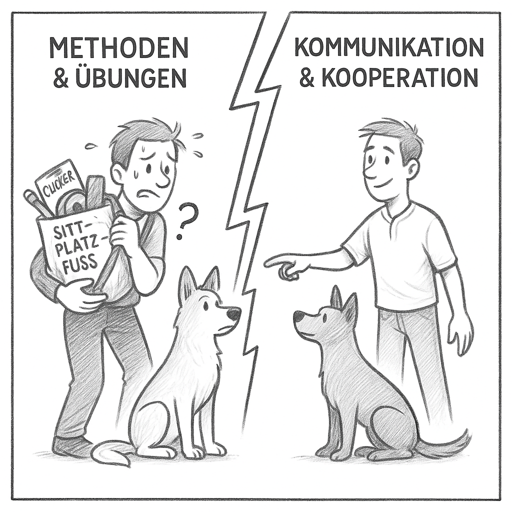Was dabei oft übersehen wird: Hinter jeder Methode steckt immer auch ein Stück Kommunikation. Nur bleibt sie meist unbewusst, zufällig, unausgesprochen. Genau deshalb fühlt sich Training oft wie „Programmieren“ an – und nicht wie echtes Miteinander.